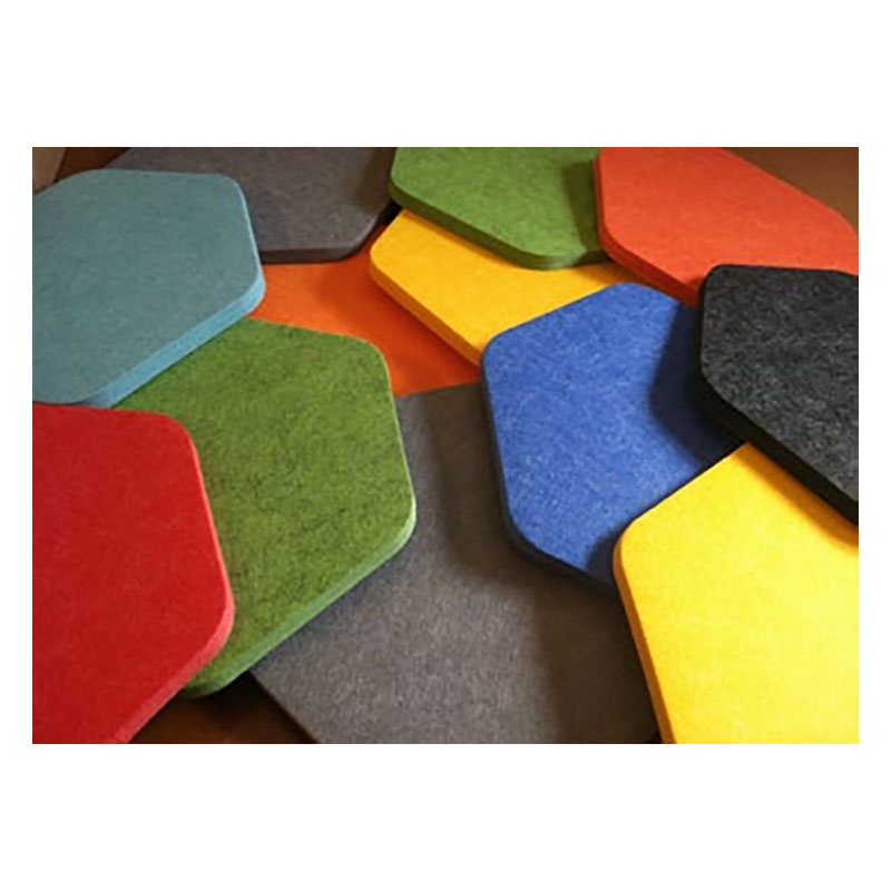 Всички влакна са хоризонтални и вертикални преплетени заедно по време на производството, което прави PET акустичната плоскост твърда, гъвкава и устойчива на удар.При пробиване с игла има много малки дупки в акустичния панел от филц PET, което прави акустичния панел от PET филц страхотен акустичен продукт за намаляване на шума и прави звука по-добър, а пространството по-тихо.