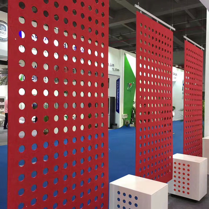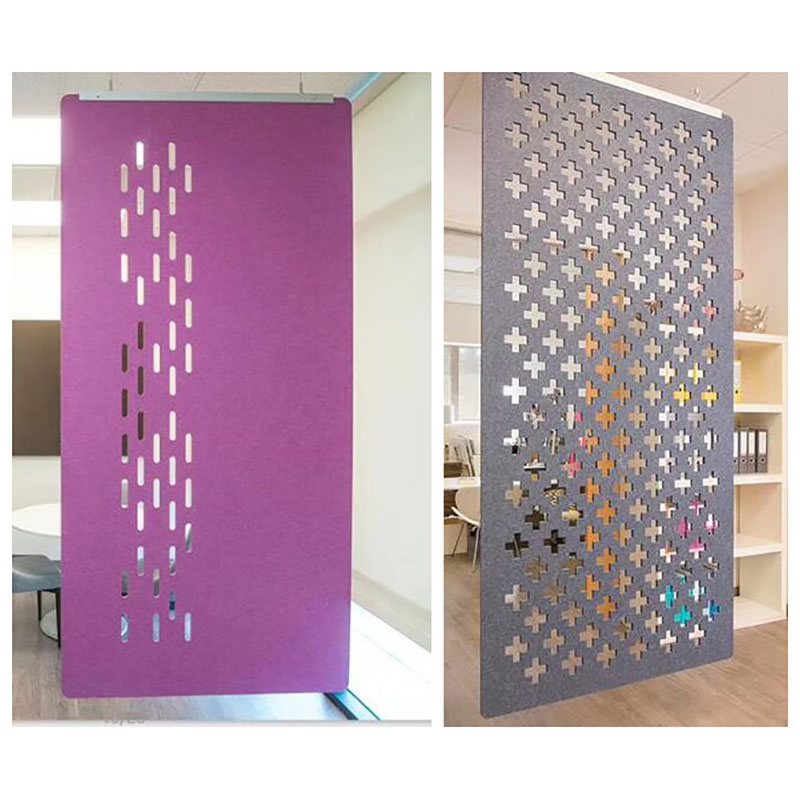 PET окачен разделител на пространството е изработен от 100% полиестер, чрез обработка с иглонабиване. Производственият процес е напълно физически и екологичен, без отпадъчни води, емисии, отпадъци. без лепило, Порестата природа на акустичния панел го прави звукопоглъщащ и топлоизолационен с характеристики на Нетоксичен, неалергенен, не дразни и не съдържа формалдехидни свързващи вещества и има висок NRC: 0,85